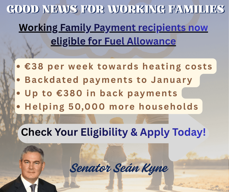 The Fuel Allowance is a welcome weekly payment of €38 for households as a contribution towards their heating costs between September and April each year. The extension of the Fuel Allowance to those in receipt of Working Family Payments comes into effect next week and will be backdated to January. This means that 50,000 additional households will now receive the Fuel Allowance.